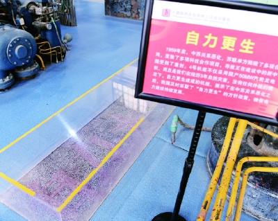 沿着红色大道,走进苏式建筑的办公楼,踩着水磨石楼梯,进入连廊,一件件老物件摆放在连廊区的展柜里:二十世纪五六十年代的操作证、工作证、洗澡证等各类证件、饭盒,以及印有俄文的设备铭牌都在向参观者讲述着过去的故事。走过展区,经过电力文化长廊就进入“汽轮机检修实操间”,也就是过去的设备车间。5台大型汽轮机组静静地躺在车间里。大型转子以及印有俄文的1号汽轮发电机还原着当时车间的原貌。操作间外地面上刻着“中苏友好”“自力更生”等标语被玻璃罩保护着,整个车间从中苏共建的1号机组到自建的4号机组和地面的标语刻字,反映新中国成立初期苏联的历史援建和在没有外援的情况下自力更生自建机组的发展过程。一个车间还原一段历史,再现了二十世纪五六十年代的历史变迁与电力文化特色。