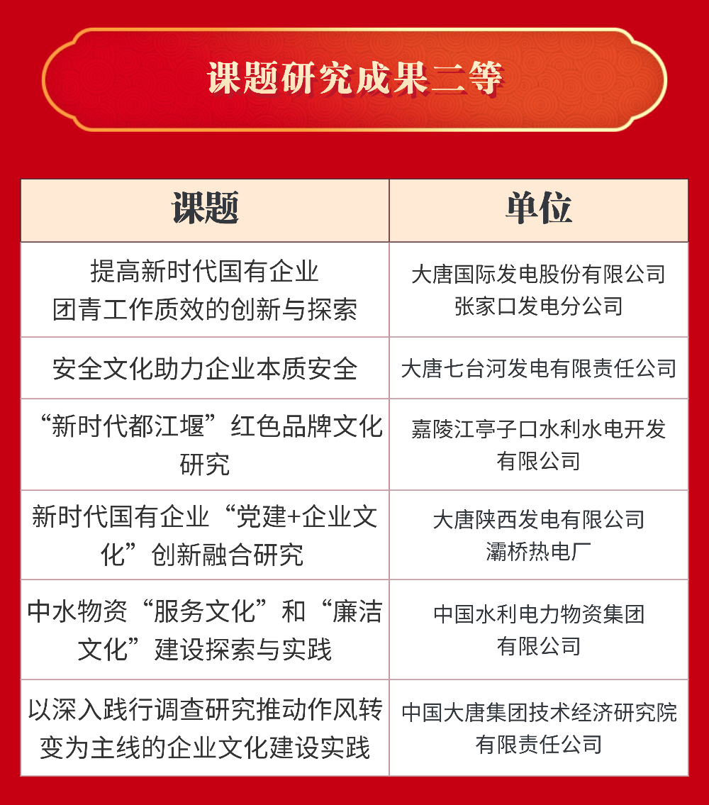 大唐国际发电股份有限公司等22家单位获评“十四五”企业文化建设与管理典型案例;中国大唐及所属8家单位获评“十四五”企业文化建设与管理典型经验;中国大唐及所属5家单位获评课题研究成果一等;大唐国际发电股份有限公司张家口发电分公司等6家单位获评课题研究成果二等。具体名单如下:
