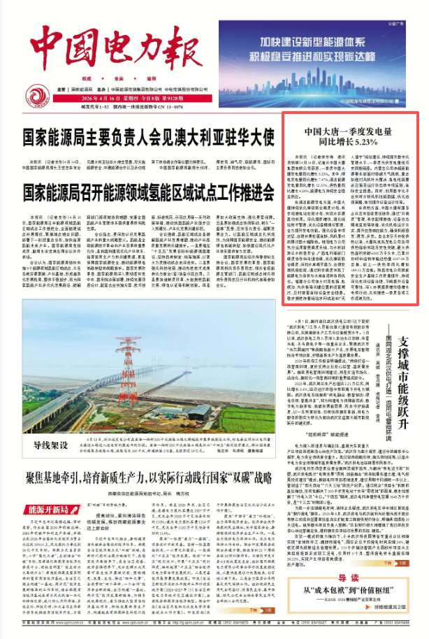 [中国电力报]2026-4-16-1中国大唐一季度发电量同比增长5.23%