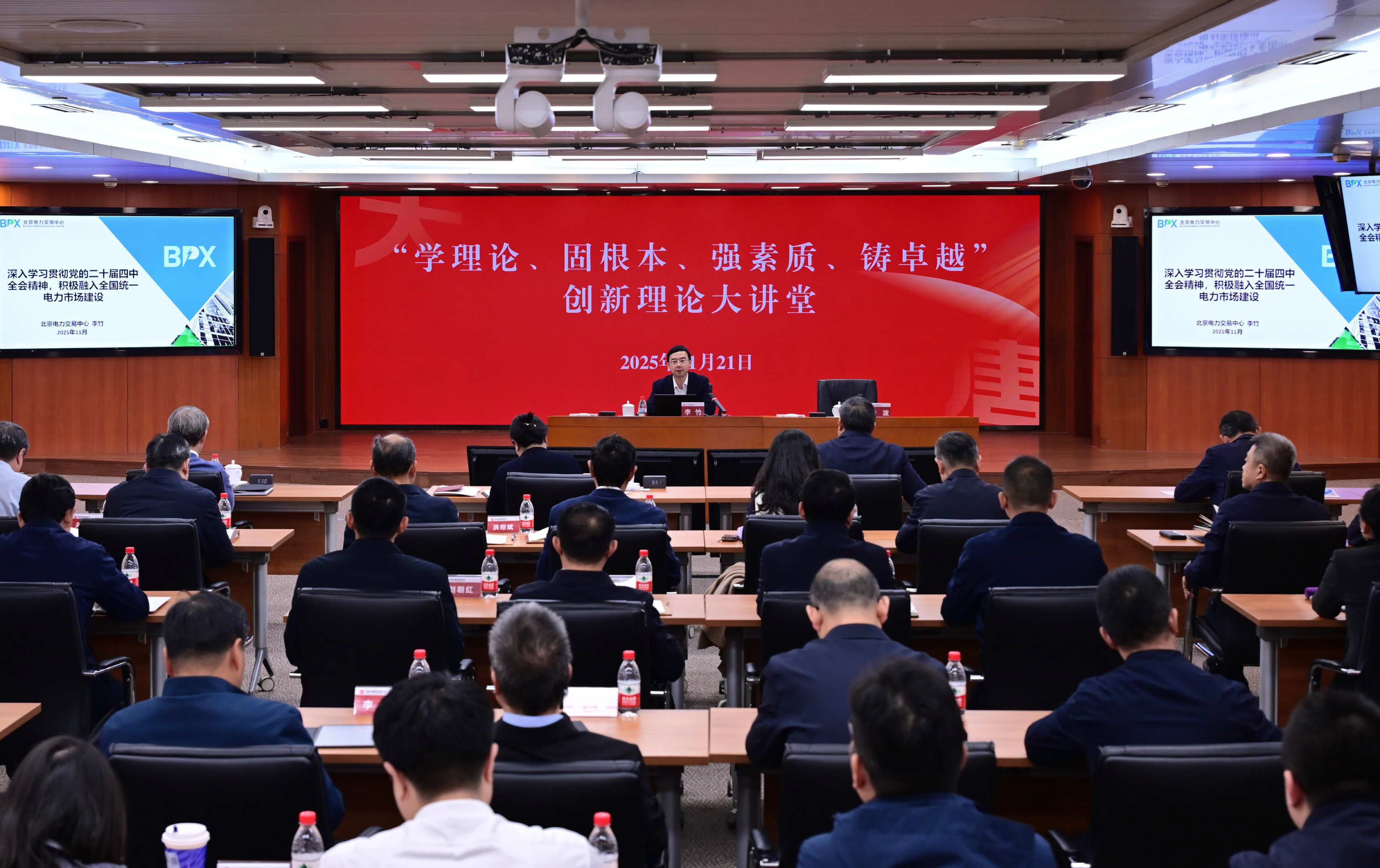 11月21日,中国大唐集团有限公司“学理论、固根本、强素质、铸卓越”创新理论大讲堂再度开讲,邀请北京电力交易中心有限公司副总经理、能源行业电力市场技术标准委员会副主任委员李竹作《深入学习贯彻党的二十届四中全会精神,积极融入全国统一电力市场建设》专题讲座。集团公司董事、党组副书记余波主持讲座,集团公司领导王瑛、曲波、陶云鹏、苟伟参加讲座。
